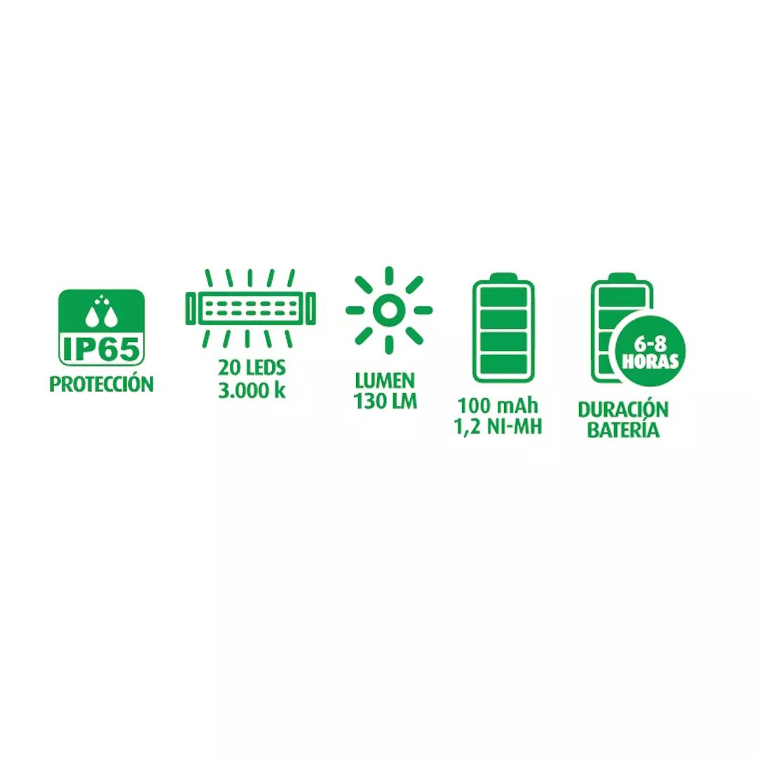 • Ricarica solare completa in 6-8 ore di esposizione alla luce del giorno.