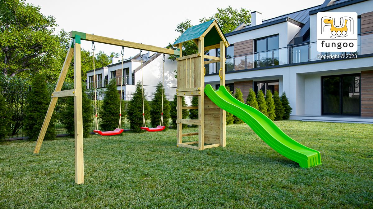 Il parco giochi Fungoo Charly-Green unisce design, sicurezza e durata. La sua struttura in legno trattato, il tetto impermeabile e le altalene doppie lo rendono uno spazio di gioco ideale per godersi l'aria aperta.